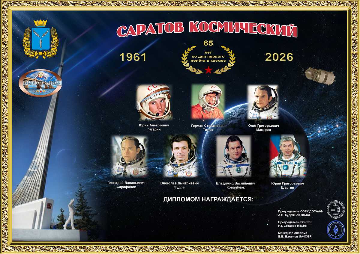 Саратовский областной радиоклуб РО ДОСААФ России по Саратовской области в честь 65-летия первого полёта первого космонавта Земли, Героя Советского Союза, лётчика-космонавта СССР, полковника авиации Юрия Алексеевича Гагарина, Дня космонавтики и то, что судьба семерых космонавтов оказалась неразрывно связанной с Саратовской областью, учредил диплом «Саратов космический» совместно с РО СРР Саратовской области и при активной поддержке «Союза Радиолюбителей Вооруженных Сил» (СРВС) и международного клуба авиаторов «Рыцари неба», проводят Дни активности радиолюбителей Саратовской области с 5 по 26 апреля 2026 года. Приглашаются принять активное участие в Днях активности радиолюбители России, ближнего и дальнего зарубежья.