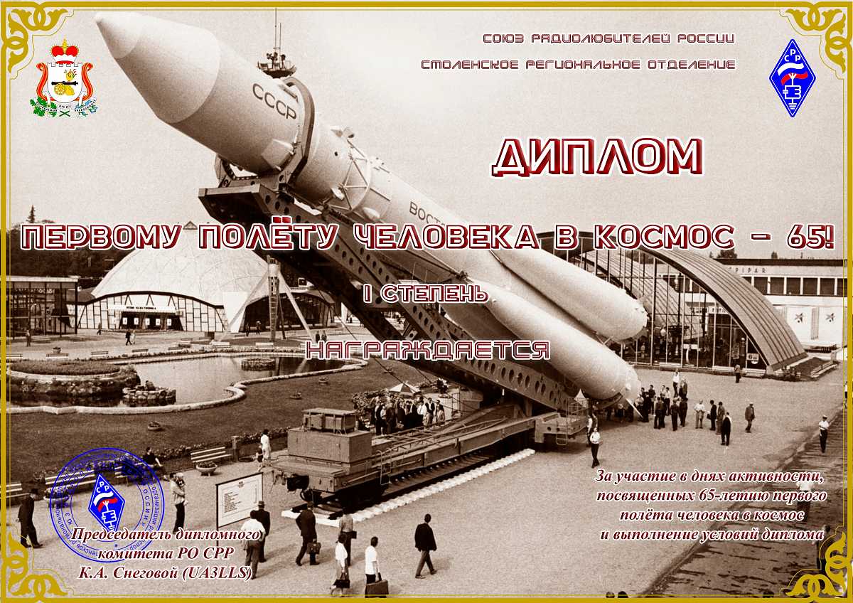 Диплом выдаётся радиолюбителям/наблюдателям России, стран СНГ и стран дальнего зарубежья за проведение QSO/SWL c радиостанциями Смоленской области с 10 по 16 апреля 2026 года всеми видами излучения на всех любительских КВ и УКВ диапазонах. Для выполнения диплома I степени необходимо набрать 65 очков. Радиосвязь с радиостанциями из RDA SM-07даёт: 8очков, с остальными радиостанциями Смоленской области: 5 очков, с радиостанциями Саратовской области: 3 очка. Радиосвязь со следующими спецстанциями даёт 5 очков: