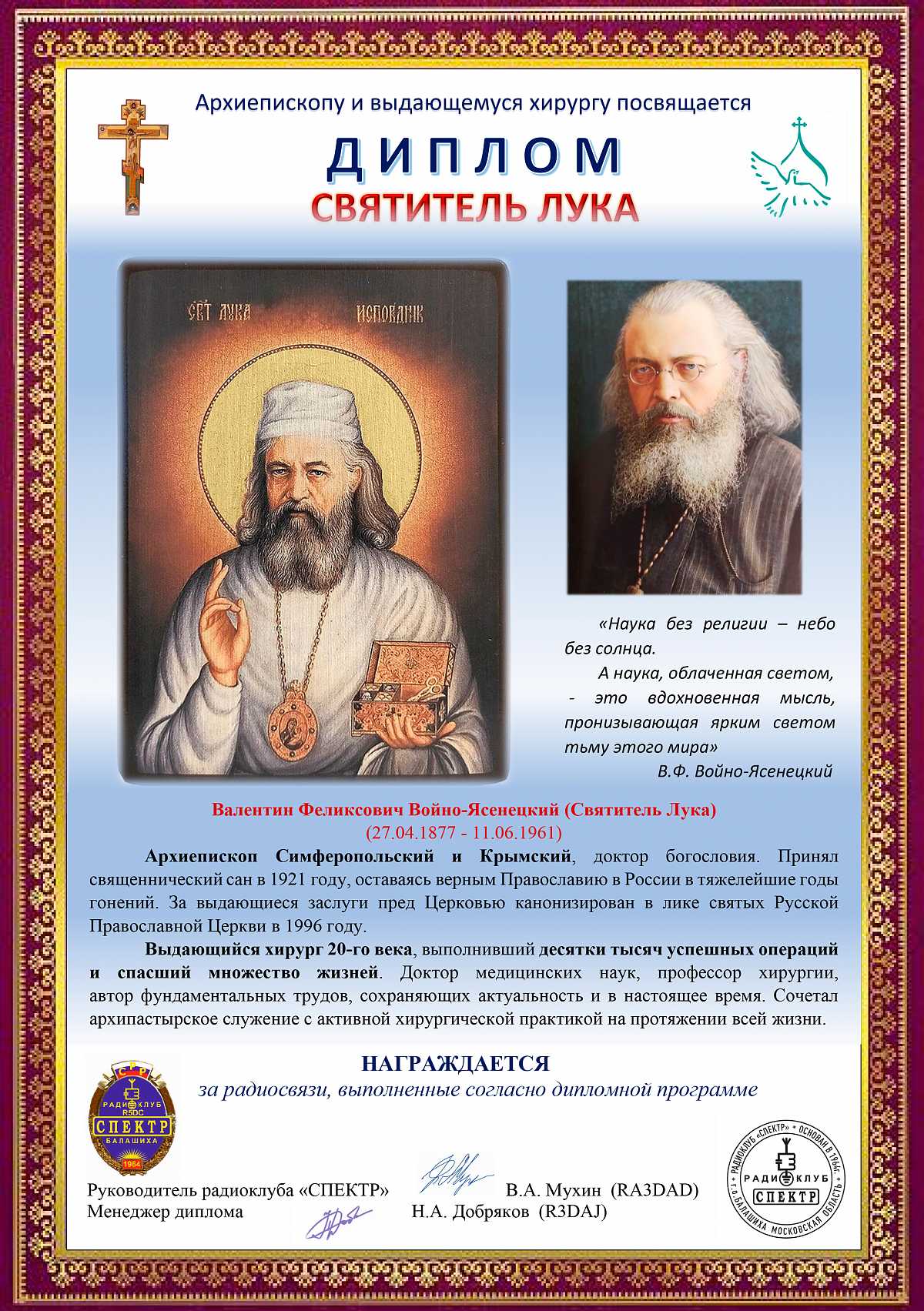 Радиоклуб «Спектр», г.о. Балашиха Московской области, с участием ветеранов ВМФ, подготовили диплом «СВЯТИТЕЛЬ ЛУКА» к 149 -и летию со дня рождения выдающегося православного архиепископа и знаменитого хирурга 20 века.