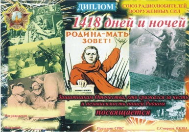 В честь защитников Отечества бойцов и командиров Красной Армии, партизан и тружеников тыла, всех, кто в грозные военные годы не щадя своей жизни сражался за честь и независимость своей Родины, Союз радиолюбителей Вооруженных Сил выдает памятный диплом «1418 дней и ночей».