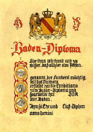 Диплом BADEN учреждён региональным радиоклубом города БРЕТТЕН (ORTSVERBAND BRETTEN / DOK: A-36) и выдается всем радиолюбителям и наблюдателям мира за QSO (SWL), проведённые с любительскими радиостанциями ФРГ из округа БАДЕН (BADEN / DOK: A), входящего в состав федеральной земли БАДЕН-ВЮРТЕМБЕРГ (BADEN-WUERTTEMBERG). В настоящее время округ БАДЕН включает в себя 53 региональных радиоклуба (DOK), входящих в структуру DARC (A-01…A-53) и 4 региональных радиоклуба (DOK), входящих в структуру VFDB (Z-06, Z-09, Z-26 и Z-29).