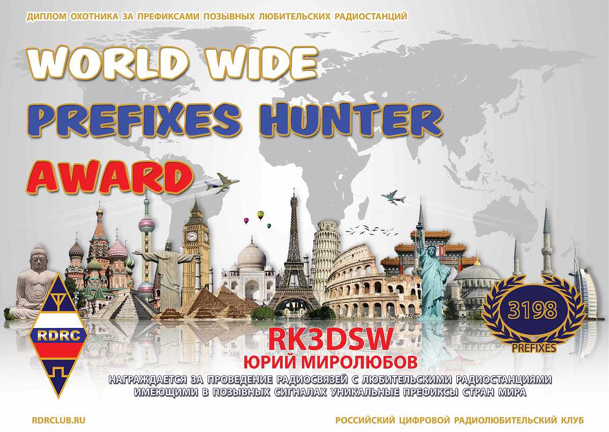Диплом охотника за префиксами позывных любительских радиостанций - World Wide Prefixes Hunter AWARD выдаётся соискателям на сайте наград РЦРК за радиосвязи любыми видами модуляции на КВ и УКВ диапазонах с любительскими радиостанциями, имеющими в позывных сигналах уникальные префиксы. Для примера показываем как определяются префиксы в следующих позывных: 9A3SWO, R2DSY, RW6AVK, R2015NY, EA8/HB9FIH и т.п. Соискатель получает диплом с возможностью многократного добавления в наклейку количества префиксов при каждой онлайн проверки лога на дипломном сайте. Базовый диплом можно получить за 100 различных префиксов. Наблюдатели могут получить диплом на аналогичных условиях. Зачёт радиосвязей (наблюдений) на диплом начинается с даты проведения соискателем первой радиосвязи.
