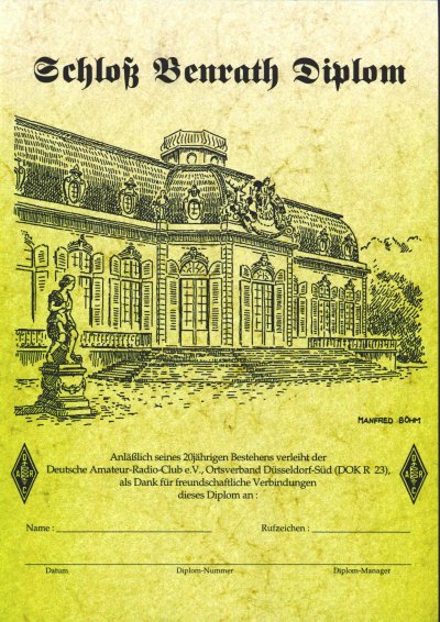 Диплом SCHLOSS BENRATH учреждён региональным радиоклубом Южного Дюссельдорфа (Ortsverband Duesseldorf-Sued / DOK: R-23). Дюссельдорф является столицей федеральной земли Северный Рейн - Вестфалия (Nordrhein-Westfalen). Диплом выдаётся всем радиолюбителям и наблюдателям мира и присуждается за QSO (SWL) с любительскими радиостанциями города Дюссельдорф.