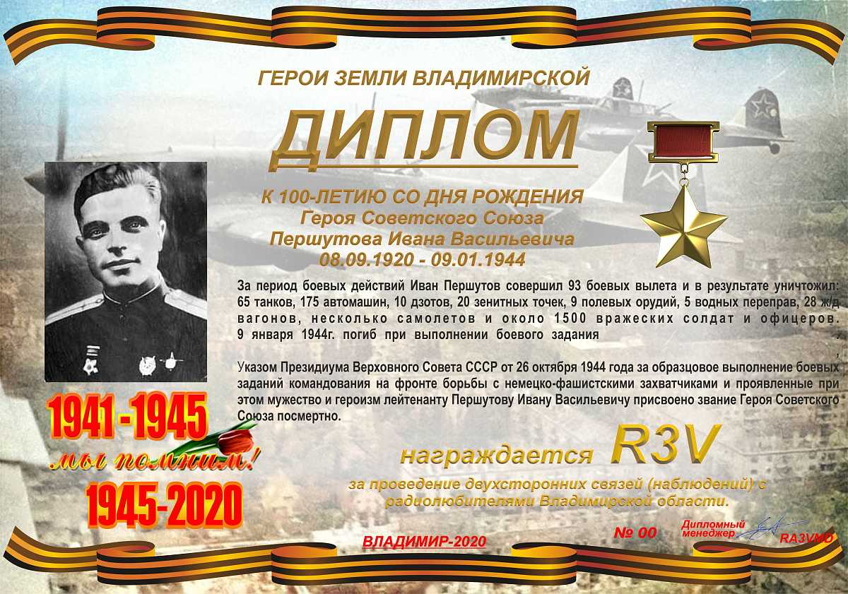 Диплом учрежден Владимирским областным радиоклубом и посвящен 100-летию со дня рождения Героя Советского Союза Першутова Ивана Васильевича – заместителя командира эскадрильи 525-го штурмового авиационного полка (227-я штурмовая авиационная дивизия, 2-я воздушная армия, 1-й Украинский фронт), лейтенанта.