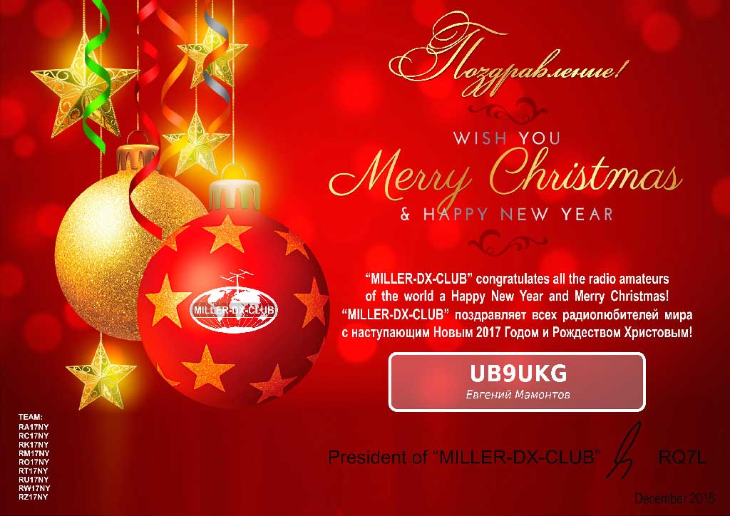 В предверии наступления Нового 2017 года Миллеровское МО СРР, клуб любителей дальней радиосвязи «MILLER-DX-CLUB» при участии Союза радиолюбителей России, проводят международный радиомарафон «Россия Новогодняя – 2017».