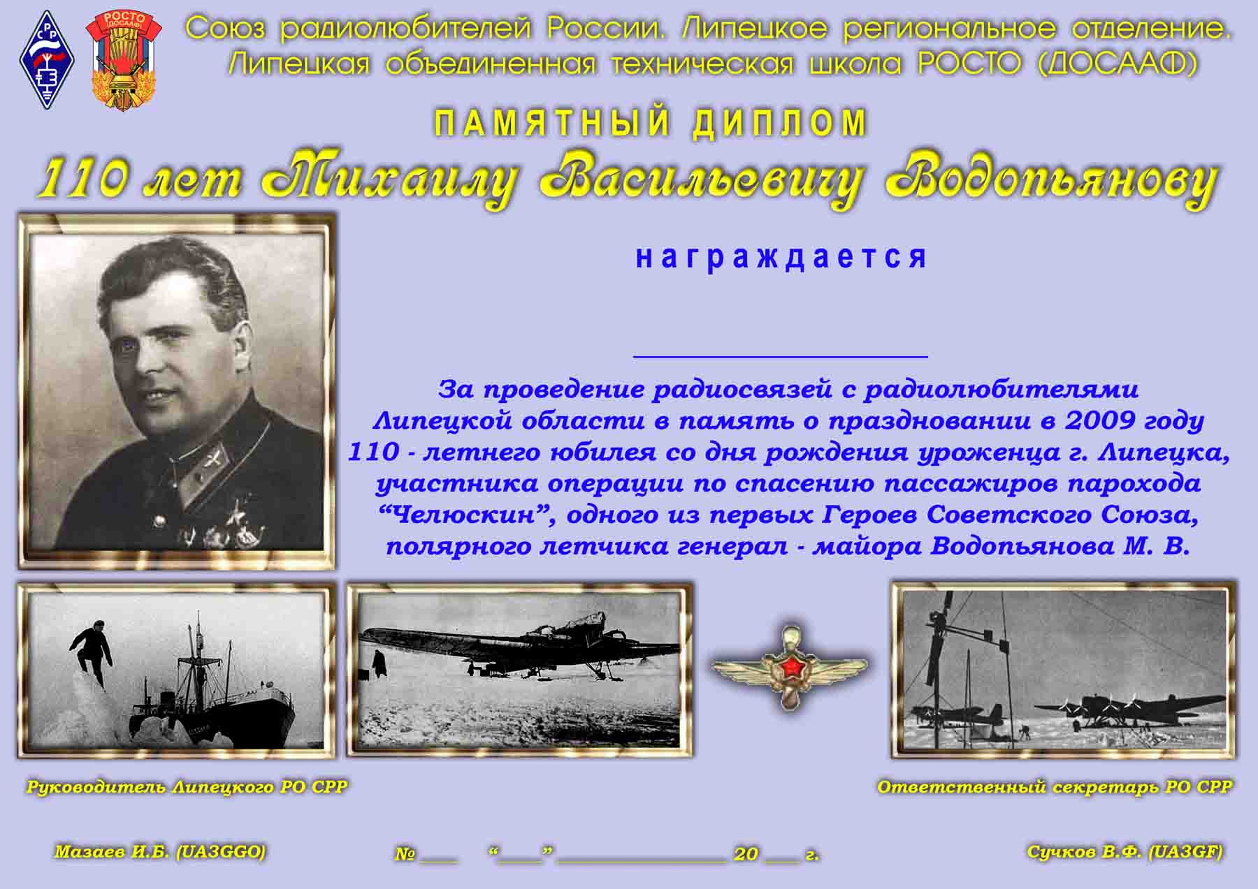 Диплом учрежден Липецким региональным отделением Союза радиолюбителей России в честь 110-летнего юбилея уроженца города Липецка, участника операции по спасению пассажиров парохода «Челюскин», участника первых авианалетов советской авиации на Берлин в августе 1941 года, одного из первых Героев Советского Союза (Золотая Звезда №6), полярного летчика генерал–майора Водопьянова М.В. (1899 – 1980).