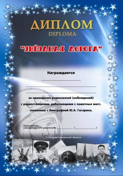 Для получения диплома необходимо в течение календарного года набрать 34 очка, что соответствует количеству лет, прожитых Ю.А. Гагариным. Засчитываются радиосвязи (наблюдения) с городами и областями, с которыми связана биография первого космонавта планеты: Смоленская обл.(3L), Саратовская обл.(4C), Владимирская обл.(3V), Оренбургская обл. (9S), Мурманская обл.(1Z), г.Байконур республики Казахстан (UN7), г.Люберцы Московской обл. (3D, RDA: MO-26). Каждая радиосвязь (наблюдение) оценивается в 1 очко. Для получения диплома необходимо провести радиосвязи не менее чем с 5 (пятью) вышеуказанными территориями. Засчитываются смешанные QSO на одном диапазоне и повторные радиосвязи на разных диапазонах. При выполнении условий диплома только на одном диапазоне - количество очков удваивается. Радиосвязи (наблюдения) на диплом засчитываются с 1 января 2009 года.