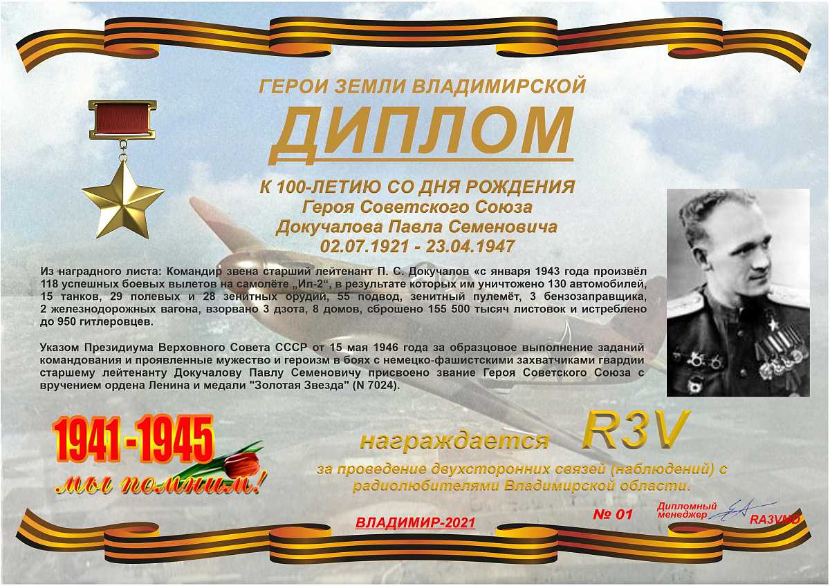 Диплом учрежден Владимирским областным радиоклубом и посвящен 100-летию со дня рождения Героя Советского Союза Докучалова Павла Семёновича - командира звена 175-го гвардейского Слуцкого Краснознаменного ордена Суворова 3-й степени штурмового авиационного полка 11-й гвардейской Нежинской Краснознаменной ордена Суворова штурмовой авиационной дивизии 16-й воздушной армии 1-го Белорусского фронта, гвардии старший лейтенанта.