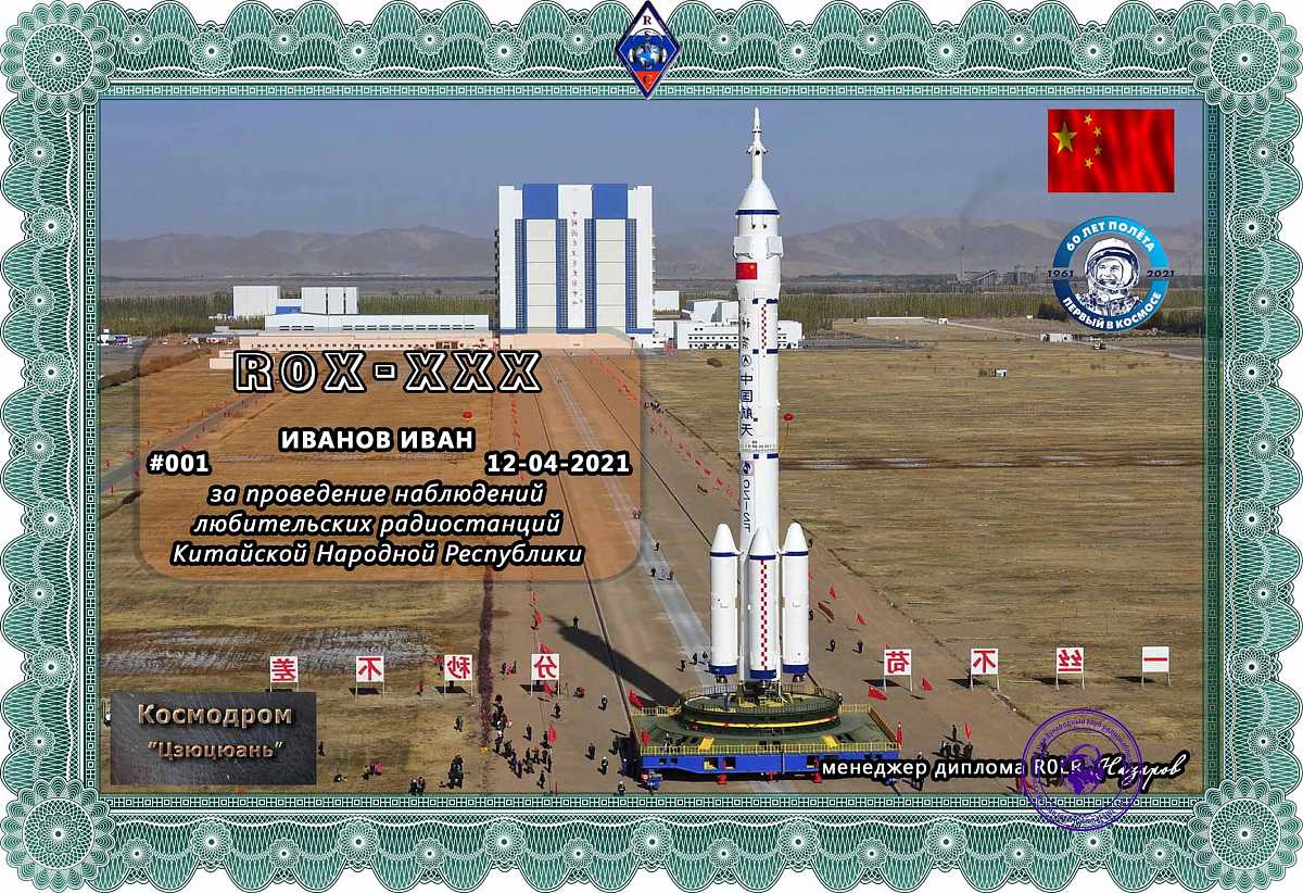 Диплом «Космодром Цзюцюань» присуждается за прием работы любительских радиостанций Китайской народной республики.