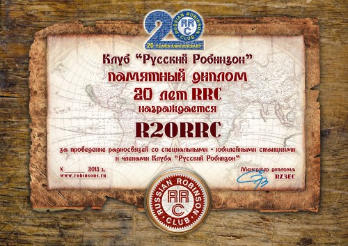 Совет клуба радиолюбителей-путешественников “Русский Робинзон” к 20-летию образования учредил юбилейный диплом “Russian Robinson Club – 20” (RRC-20).