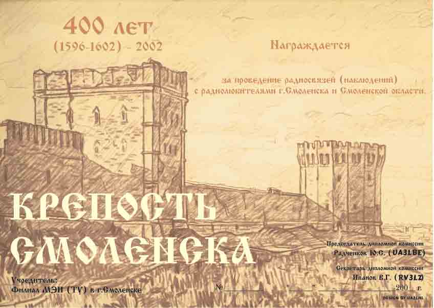 Диплом выдаётся радиолюбителям (наблюдателям) России, стран СНГ и зарубежных стран за проведение QSO (SWL) c радиостанциями г.Смоленска и Смоленской области (R3L*, RA3-RZ3L*, U3L*, UA3L*, UE3L*).