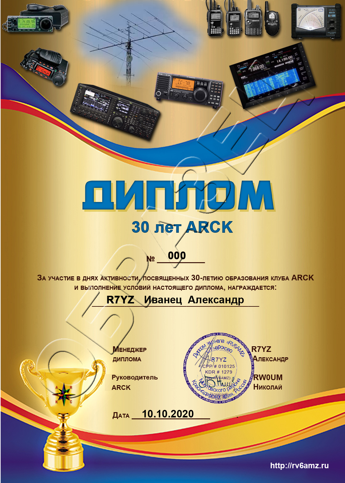 Зачетный период с 15-01-2021 г. по 25-01-2021 г. Для получения диплома нужно набрать 30 баллов. Повторы c радиолюбителями членами клуба ARCK допускаются только на разных диапазонах. Разными видами передач повторы не допускаются. За QSO с радиолюбителем, членами клуба ARCK - 1 баллов. На 160 и УКВ очки удваиваются.