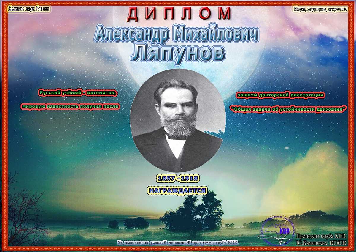 В рамках дипломной программы «Великие люди России – Историческое наследие» вашему вниманию предоставляется диплом «Александр Михайлович Ляпунов», для получения которого необходимо набрать 1000 очков. Связи на диплом засчитываются с 22 сентября 2021 года, диплом бессрочный.
