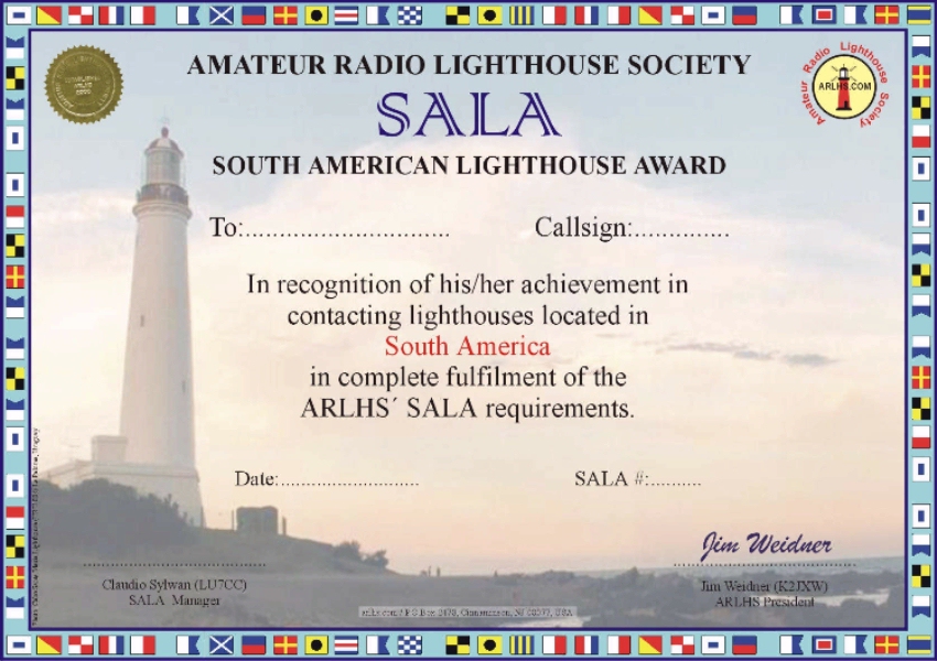 1- The South American Lighthouse Award is issued by the Amateur Radio Lighthouse Society (ARLHS) to the amateur radio operator or SWL who has proof of radio contacts with lihgthouses located in the South American territory. Countries: Argentina, Bolivia, Brazil, Chile, Colombia, Ecuador, French Guiana, Guyana, Paraguay, Peru, Surinam, Uruguay, Venezuela and the islands belonging to South America (*). (*) All the islands belonging to South America in agreement with the DXCC official list (note that DXCC's list is not in total agreement with the IOTA list when regarding continents, for example South Shetland Islands are in South America for the DXCC while they are in Antarctica for IOTA). 2- Only contacts with lighthouses included in the ARLHS official list are valid. This list is available at:: arlhs.com/awards/arlhs-numbers.html 3- Contacts will be verified by sending the QSLs or xerox copies of them (showing all the data of the contacts). If QSLs are sent, they will be returned together with the award. 4- All the ARLHS Award program requirements will apply. Basically: Bands: 160, 80, 40, 30, 20, 17, 15, 12, 10, 6, 2 and 0.7 m. Modes: all (including satellite and repeaters). Cross band contacts are not valid. Date: no date restriction. All confirmed QSOs are valid. QSLs: they must show either the name of the lighthouse or its ARLHS number. 5- South American stations must show proof of contacts with 8 lighthouses of 4 or more different South American countries. Stations from outside South America must show proof of contacts with 4 lighthouses from different South American countries (*). (*) example: Ecuador and Galapagos Islands count as two "countries". 6- Fees: The cost of the award is set by the ARLHS. Currently, the cost is: $3.- (or 4 IRC) for ARLHS members, and $5.- (or 6 IRC), for non members.