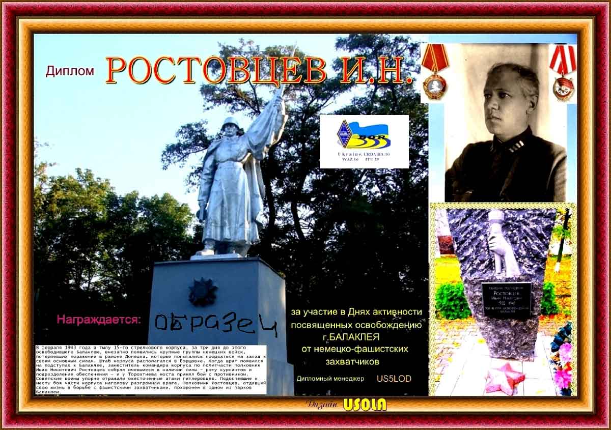 Памятный диплом “Ростовцев И.Н.” учрежден Балаклейским Обществом Радиолюбителей (БОР) и посвящен115 –ой годовщине со дня рождения гвардии полковника Ростовцева Ивана Никитовича(1902-1943г.), погибшего 11.02.1943 г. в бою за освобождение Балаклейщины от немецко-фашистских захватчиков и присуждается за проведение 3-х радиосвязей с любительскими радиостанциями Балаклейского р-на Харьковской области ( HA - 10 по списку «URDA»).