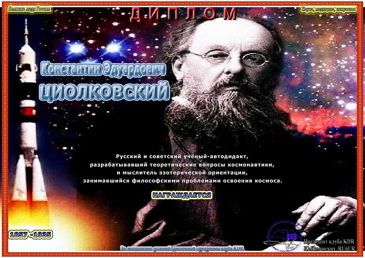 В рамках дипломной программы «Великие люди России – Историческое наследие» вашему вниманию предоставляется диплом «Константин Эдуардович Циолковский», для получения которого необходимо набрать 1000 очков. Связи на диплом засчитываются с 13 октября 2021 года, диплом бессрочный.