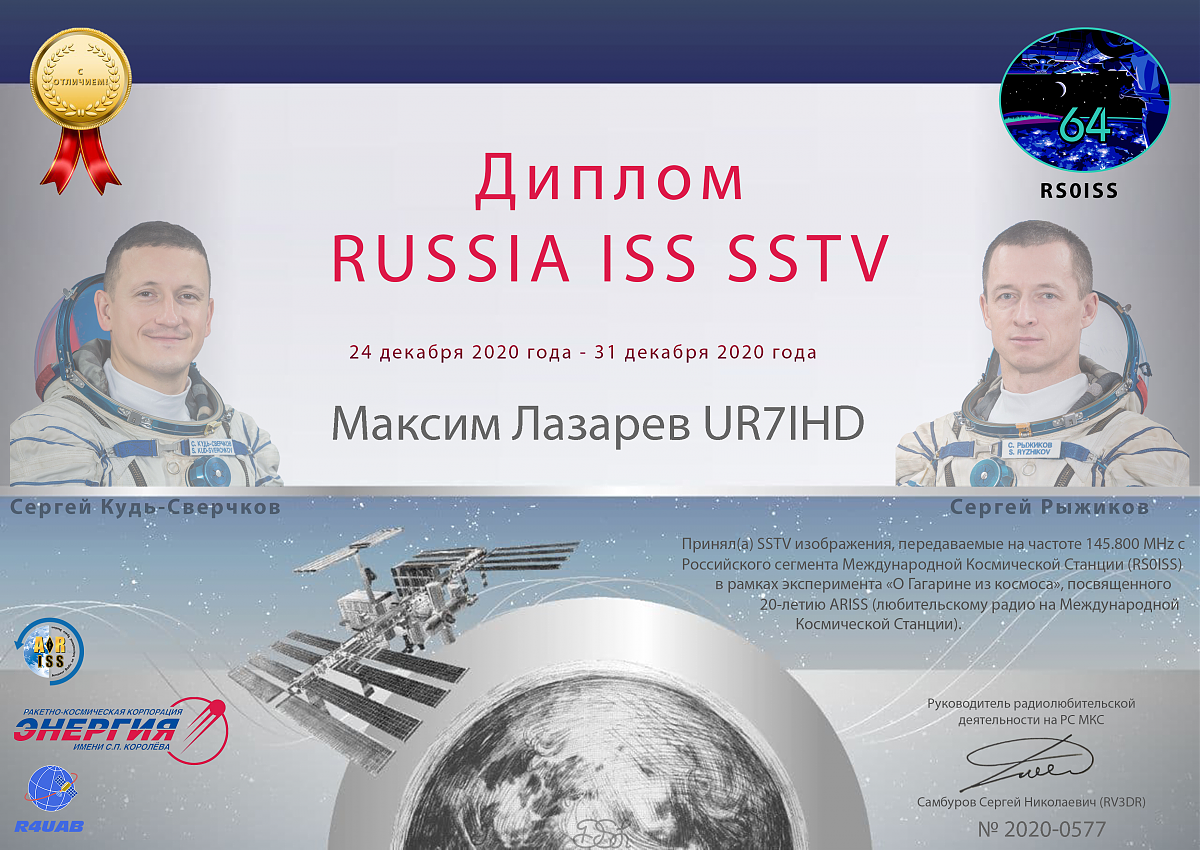 Диплом «Russia ISS SSTV» присуждается радиолюбителям (наблюдателям) за прием передач SSTV (slow-scan television) с борта Международной Космической Станции (МКС) в рамках космического эксперимента (КЭ) «О Гагарине из космоса».