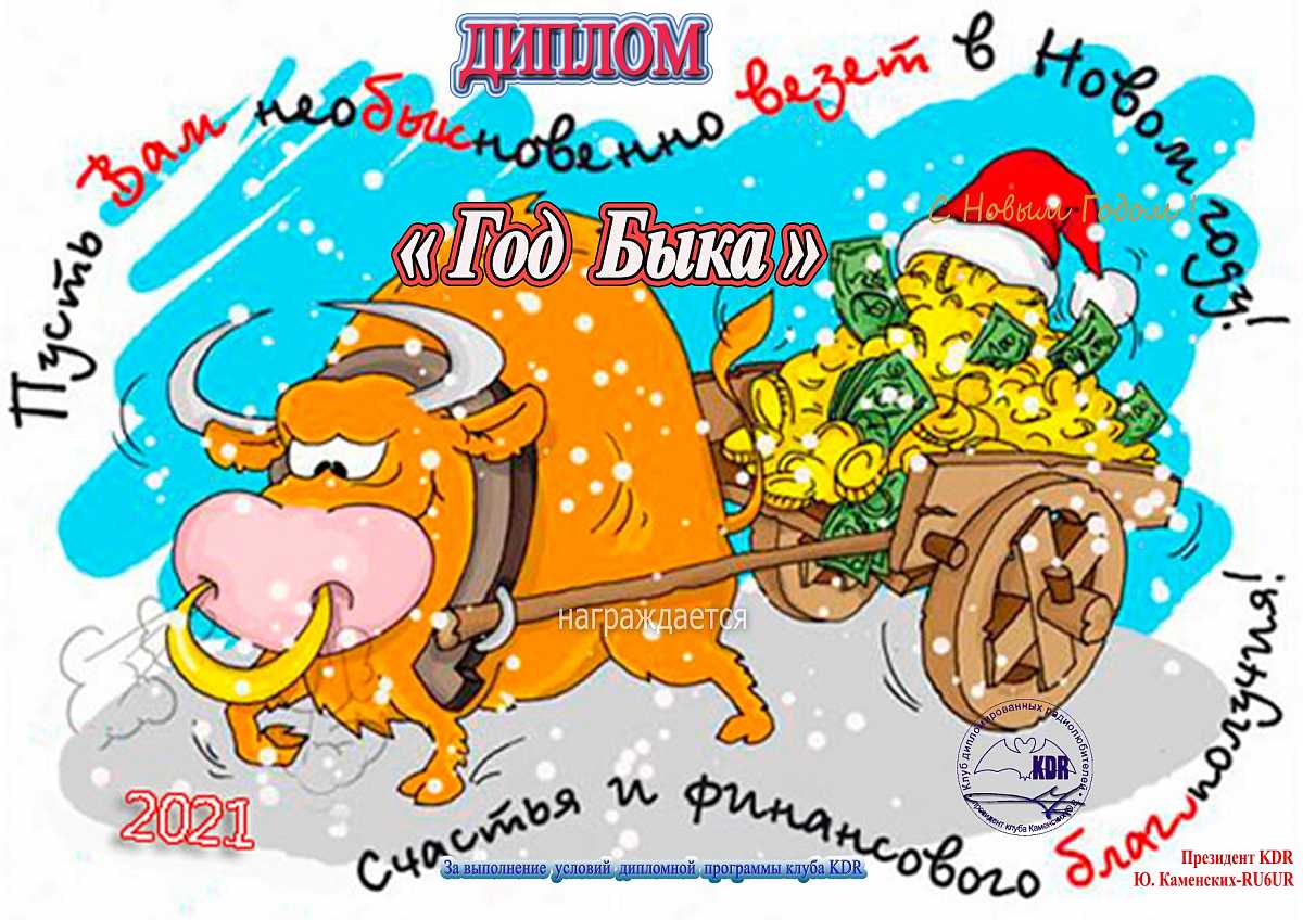 Учрежден Советом Клуба KDR в честь празднования Нового 2021 года. Для получения диплома в период 01 по 10 января 2021 года нужно провести не менее 21 QSO с радиолюбителями мира и 21 QSO с радиолюбителями России. Все виды излучения и разрешенные диапазоны. Повторные связи не засчитываются.