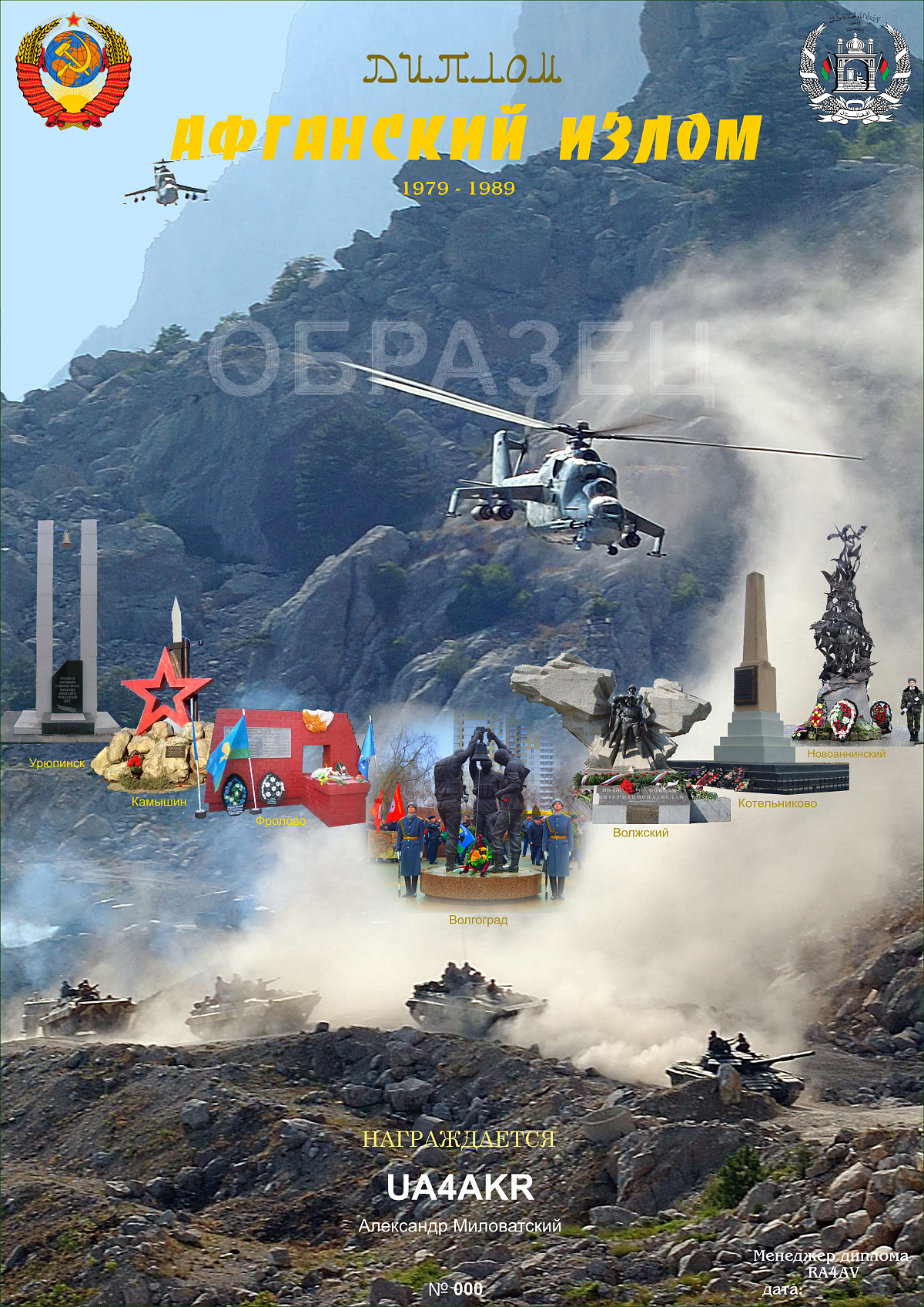 DIPLOMА "Afghan Breakdown" Volgograd region 32nd Anniversary of the Withdrawal of Soviet troops from Afghanistan. The diploma is dedicated to the memory of the Volgograd native Afghan war participants deceased or gone missing during the war, those who lost their life to illness or wounds post war, and those still living. 1979 - 1989 February 15 - Day of Remembrance of Soldiers-Internationalists.To receive this diploma, radio amateurs have to get at least 32 points for radio communications with radio stations in the Volgograd region from 21:00 UTC time <strong>11</strong> to 20:59 UTC time on February <strong>15</strong>, 2021. Each QSO with individual radio stations is worth 2 points, with memorial radio stations:<strong>UE32AI, UE32WA, R4BB</strong> - 5 points each Repeated radio communications are valid on different bands and different modes of CW; SSB; DIGI (all digital types count as one Digital type). To receive the diploma, an activator should have at least 100 QSOs. The same conditions apply for SWL as for transmitting radio stations. (the application is filled out in the standard form in any text editor and submitted to the diploma manager at RA4AV@mail.ru). QSL for <strong>UE32AI</strong> to the personal address: Yuri Savotenkin, ul. Engel's, 5 - 107, Volzhsky, VG, 404111, Russia (Sase direct), or eQSLcc, or HAMLOG.online QSL for <strong>R4BB</strong> via HAMLOG.online, or QSL Bureau QSL for <strong>UE32WA</strong> via HAMLOG.online The diploma is posted on the <strong>Hamlog.online</strong> service and is issued in electronic version only based on the loaded LOG's activators. The diploma is free. Diploma manager Yu.Savotenkin (RA4AV)