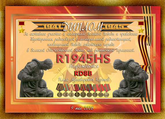 В 2026 году, отдавая дань памяти и уважения тем, кто защищал нашу Родину в годы Великой Отечественной войны, включая и тех, кто ковал эту победу в тылу, в знак глубокого уважения и благодарности за их вклад в общую Победу над фашизмом, позывной R1945HS звучит с 1 мая по 31 мая 2026 г.