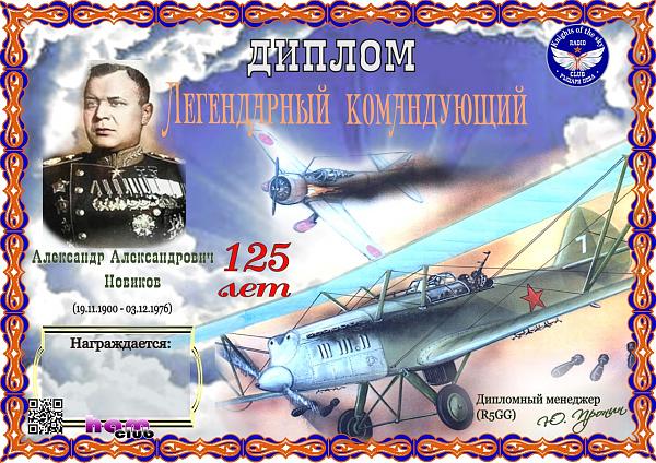 Клуб радиолюбителей-авиаторов «Рыцари неба» с 11 по 21 ноября 2025 г. проводит дни активности, посвящённые 125-летию со дня рождения дважды Героя Советского Союза Главного маршала авиации А.А. Новикова и представляет диплом, посвящённый этому событию.