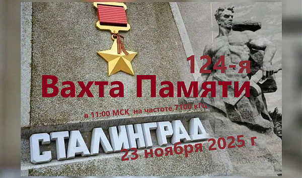23 ноября 2025 г. в 11:00 МСК на частоте 7,100 МГц Волгоградский областной радиоклуб «Импульс» РО ДОСААФ России, совместно с радиоклубом «Боевое братство» города Воинской славы Калач-на-Дону, проводит 124-ю международную Вахту Памяти в эфире посвященную 83-й годовщине начала контрнаступления советских войск под Сталинградом (19 ноября 1942 г. — 2 февраля 1943 г.)